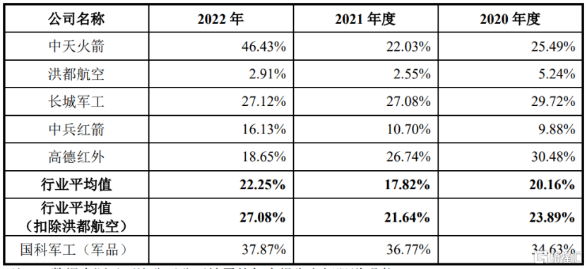 报告期内,公司的综合毛利率分别为33.49%、34.80%、37.07%,其中军品毛利率由34.63%上升至37.87%,高于同行业可比上市公司毛利率水平。