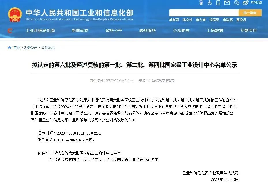 近日,根据《工业和信息化部办公厅关于组织开展第六批国家级工业设计中心认定和第一批、第二批、第四批复核工作的通知》(工信厅政法函(2023)199号),工业和信息化部发布“拟认定的第六批及通过复核的第一批、第二批、第四批国家级工业设计中心名单公示”。