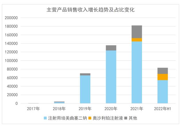 目前,在政策端明显可以看到仿制药集采中标规则更加温和,从“4+7”城市集采的最低价独家中标,改为 1-3 家中标,直至目前的多家中标,政策目标也从单纯追求价格降幅向在保证产品质量和稳定供应的前提下进行降价,有利于药品企业获取合理利润。其次,2022 年5 月 25 日,国务院办公厅印发的《深化医药卫生体制改革 2022 年重点工作任务》,提出“扩大采购范围,力争每个省份国家和地方采购药品通用名数合计超过 350 个”,2021年 9 月 29 日,国务院办公厅印发《“十四五”全民医疗保障规划》提到,药品带量采购品种数 2025 年预期目标大于 500 个。此前国家开展的六批七轮国家集采中标药品数量已经达到 234 个,第七批国采有 60 个药品采购成功,合计 294 个。考虑到集采首先纳入的是市场规模较大的品种,且目前纳入集采品种已经达到计划数目 60%左右,市场人士普遍认为,集采对于医药行业上市公司业绩的冲击已经接近尾声,集采对于市场的影响将进一步弱化,药品领域政策负面因素已经充分体现,并已经出现边际改善。汇宇制药作为一家肿瘤领域的高端仿制药企业,仿制药储备多,且研发投入持续,随着仿制药行情回暖,其优质仿制药产品逐渐进入接棒发力模式。根据CDE官网显示,目前公司药品在国内已进入集采的共6个,分别为注射用培美曲赛二钠、多西他赛注射液、注射用阿扎胞苷、紫杉醇注射液、奥沙利铂注射液、注射用苯达莫司汀;已经在国内上市的共6个,分别为酸伊立替康注射液、注射用硼替佐米、盐酸帕诺洛司琼注射液、左乙拉西坦注射用浓溶液、丙戊酸钠注射用浓溶液、普乐沙福注射液;已经提交上市申请的药品共9个,分别为氟维司群注射液、苯磺顺阿曲库铵注射液、米力农注射液、注射用盐酸吉西他滨、氟尿嘧啶注射液、唑来膦酸注射液、注射用唑来膦酸浓溶液、注射用盐酸表柔比星、硫代硫酸钠注射液。2022年中报显示,公司实现境内销售收入为 80066.51 万元,主要产品注射用培美曲塞二钠销售收入超过 5.44 亿元,奥沙利铂注射液销售收入超过 1.44 亿元,其他 5 个上市产品贡献收入约 1.13亿元,培美曲塞二钠占比优化至65.51%(2019年,2020年,2021年分别为93.36%、91.15%、79.49%),产品收入结构得到了近一步的优化。