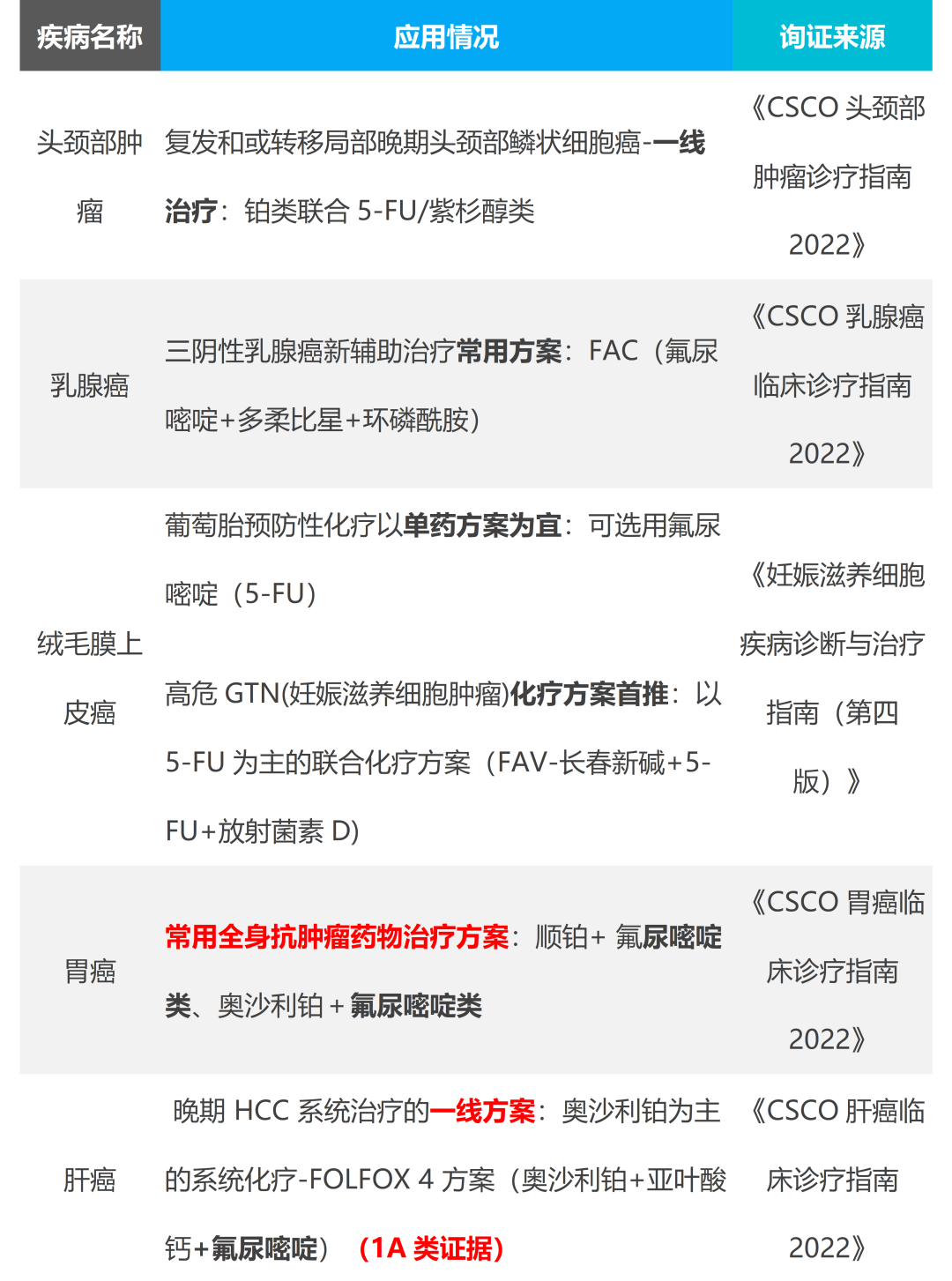氟尿嘧啶的抗瘤谱较广,适用于消化道肿瘤、绒毛膜上皮癌、乳腺癌、卵巢癌、肺癌、宫颈癌、膀胱癌及皮肤癌等,是国内外一线推荐化疗用药。并且氟尿嘧啶覆盖结直肠癌、胃癌的全程治疗,在消化道肿瘤治疗中为优选用药,多癌种用药询证证据充足。