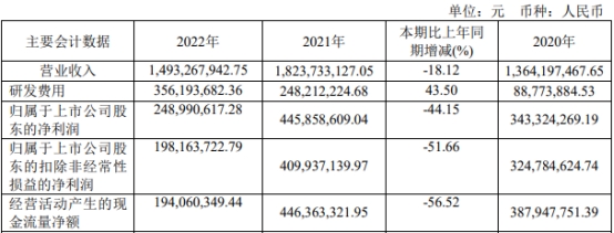 2022年,公司实现营业收入14.93亿元,同比减少18.12%;归属于上市公司股东的净利润2.49亿元,同比减少44.15%;归属于上市公司股东的扣除非经常性损益的净利润1.98亿元,同比减少51.66%;经营活动产生的现金流量净额1.94亿元,同比减少56.52%。