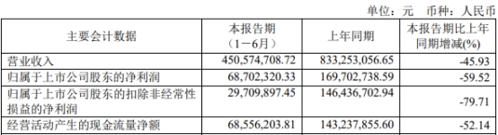 汇宇制药(688553.SH)近日发布2023年半年度报告。今年上半年,公司实现营业收入4.51亿元,同比减少45.93%;归属于上市公司股东的净利润6870.23万元,同比减少59.52%;归属于上市公司股东的扣除非经常性损益的净利润2970.99万元,同比减少79.71%;经营活动产生的现金流量净额6855.62万元,同比减少52.14%。