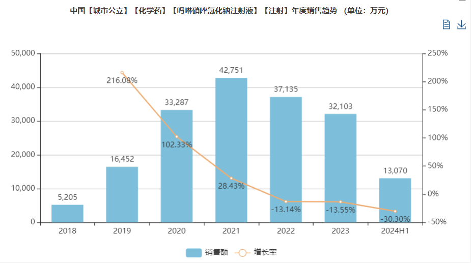 吗啉硝唑氯化钠注射液被列为国家医保乙类药品。据米内网数据显示,2024年上半年中国城市公立医院终端的吗啉硝唑氯化钠注射液销售额约1.3亿元。汇宇制药的吗啉硝唑氯化钠注射液作为首仿上市,市场前景广阔。