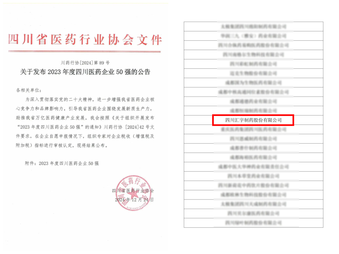 近日,四川省医药行业协会正式发布了2023年度四川医药企业50强的公告,汇宇制药凭借卓越的综合实力与突出的行业影响力成功入选。此次入选不仅是对汇宇制药高质量发展的肯定,也是对其为推动四川医药产业发展所作贡献的高度认可。