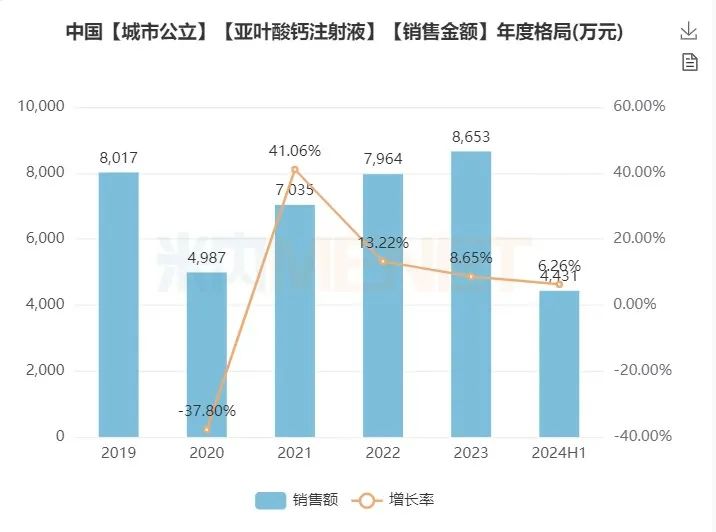 亚叶酸钙注射液为国家医保甲类、国家基药,被国内外多个指南推荐,是多种恶性肿瘤的化疗帮手。据米内网数据显示,2024年H1中国城市公立医院终端亚叶酸钙注射液销售规模为4431万元,呈现逐年增长的趋势,市场前景可观。