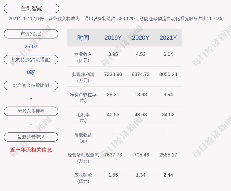 2021年1至12月份,兰剑智能的营业收入构成为:通用设备制造占比88.17%,智能仓储物流自动化系统服务占比11.74%。