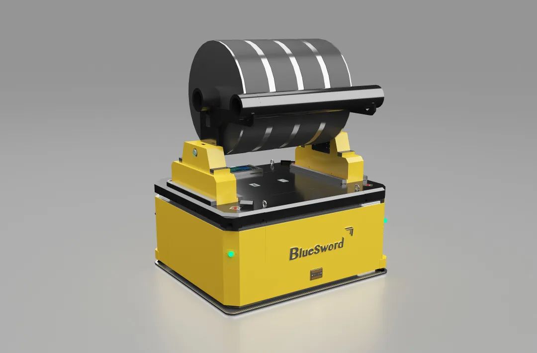 在锂电池产线前工序环节,兰剑智能打造了双工位卷料举升机器人AGV,最大负载3500kg,可实现极卷物料在产线内部工序机台间的搬运对接功能。