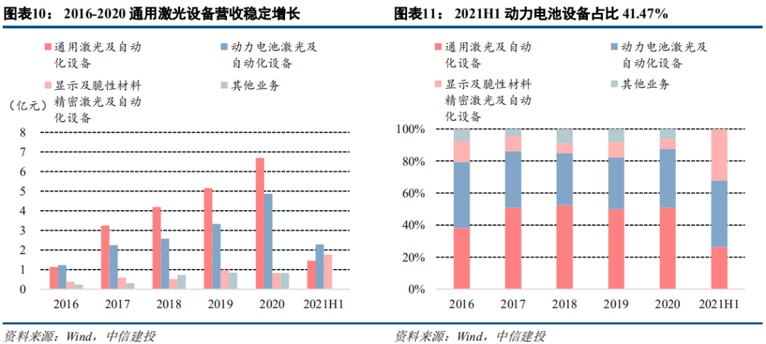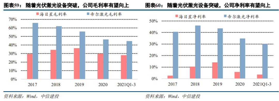 公司进军光伏激光设备,打开成长新空间。公司于2021年初左右进军晶硅太阳能电池领域,产品包括全自动激光开槽设备、全自动激光掺杂设备、全自动无损激光划裂设备等。根据2021年中报,公司在光伏行业的在研项目有太阳能电池激光加工技术开发、超快激光技术研发等。整体来看,公司在激光器和激光应用领域拥有众多优质人才,凭借对激光以及激光和材料相互作用机理方面的深刻理解,公司快速完成了光伏激光设备的研发制造,未来有望获得市场端的突破。对标帝尔激光,公司进军光伏激光设备,还将有利于盈利能力的提升。