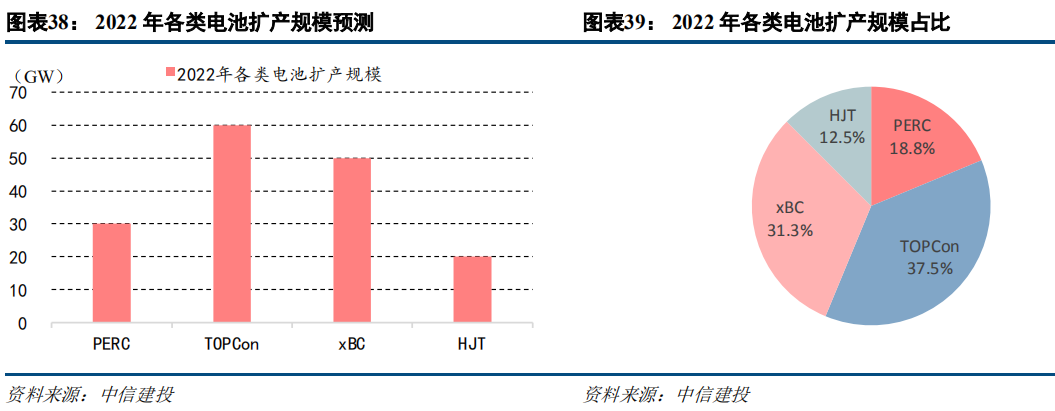 高效太阳能电池技术渗透率快速提升。随着相关工艺技术的发展以及产业链的逐渐完善,2022年各大厂商逐渐由观望到入局,纷纷宣布新型光伏电池扩产计划,TOPCon、HJT、IBC等高效电池渗透率有望加快。根据我们对于今年电池技术路线的判断,预计2022年PERC电池扩产约30GW,TOPCon电池扩产约60GW,HJT电池扩产约20GW,xBC电池扩产约50GW(其中P型约30-40GW)。