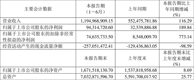根据半年报,公司第二季度实现营业总收入7.48亿元,同比增长75.47%,环比增长67.53%;归母净利润8320.46万元,同比增长51.06%,环比增长648.91%;扣非净利润6887.89万元,同比增长98.96%,环比增长1096.46%。