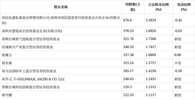 半年报显示,2022年上半年末的公司十大流通股东中,新进股东为景顺长城景气进取混合型证券投资基金、信诚新兴产业混合型证券投资基金、高华-汇丰-GOLDMAN, SACHS & CO. LLC、景顺长城科技创新混合型证券投资基金、蔡丹娜。在具体持股比例上,詹珊玉持股有所上升,国信弘盛私募基金管理有限公司-深圳市国信蓝思壹号投资基金合伙企业(有限合伙)、深圳市慧悦成长投资基金企业(有限合伙)、易方达国防军工混合型证券投资基金持股有所下降。