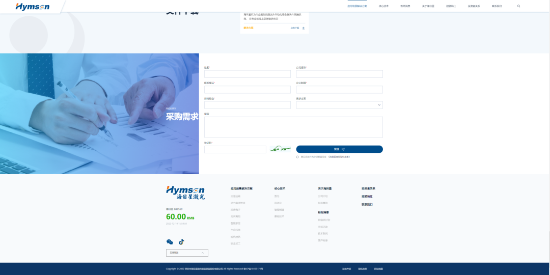 新版网站作为便捷交流与及时反馈的沟通窗口,在“应用解决方案”、“产品详情”页面都预设了留言页面,与用户进行直接交互。海目星将以学习者与同行者的姿态,接纳建议、积极商谈、答疑解惑,为用户提供更加细致的服务。
