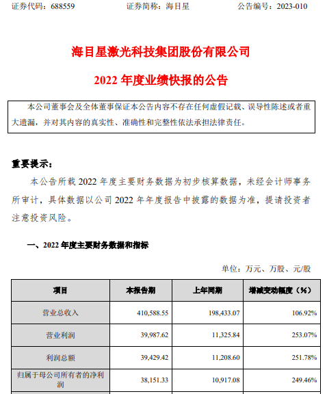 2月28日,海目星(688559)发布2022年度业绩快报,公告显示,2022年度营业总收入为410,588.55万元,比上年同期增长106.92%;归属于母公司股东的净利润为38,151.33万元,比上年同期增长249.46%。