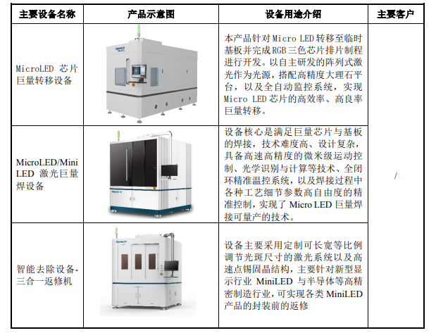 目前,海目星新型显示行业中心生产制造的激光及自动化设备适用于新型显示行业小间距 LED 及Micro/Mini LED 芯片段、显示模组段、显示集成段等显示全制程相关应用,产品覆盖了 Micro/MiniLED 切割、转移、键合、检测和修复等行业关键工艺流程。