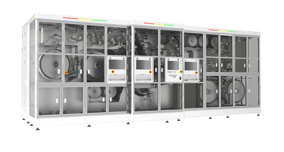 海目星方形切卷一体机将激光模切与卷绕优化整合于一体,融合高速激光切割极耳成型、CCD检测与激光模切闭环控制、锥度张力控制、CCD与多级纠偏闭环联动控制、高速高精度凸轮追切控制、极耳防翻折控制、粉尘收集控制等关键技术,有效解决极耳对齐度、极耳错位问题,解决电芯安全问题,在张力控制、极耳切割精度、极片裁断效率等方面均具备行业优势。
