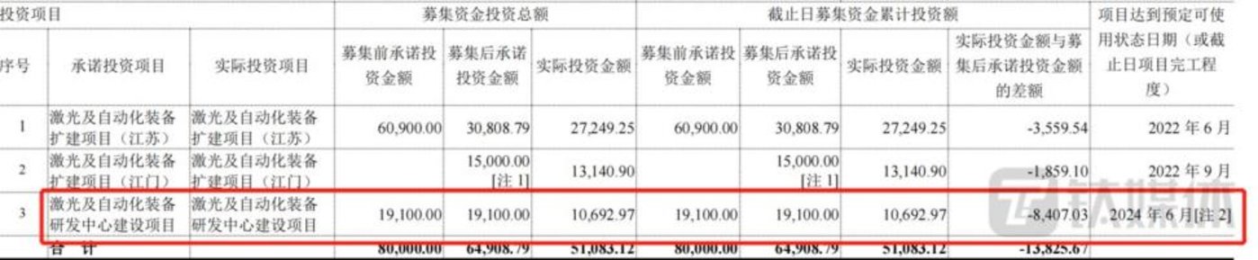 此外,项目二与前次募投项目“激光及自动化装备研发中心建设项目”的建设内容整体较为一致,而公司将前次募投项目达到预定可使用状态的时间延长至2024年6月。