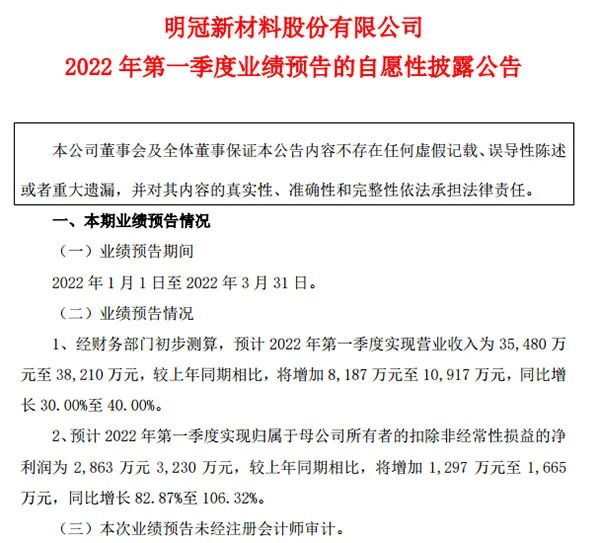 3月29日,明冠新材发布2022年一季报预告称,预计公司2022年第一季度实现营业收入为3.55亿元至3.82亿元,较上年同期相比,同比增长30%至40%。预计实现归属于母公司所有者的扣除非经常性损益的净利润为2863万元-3230万元,同比增长82.87%-106.32%。