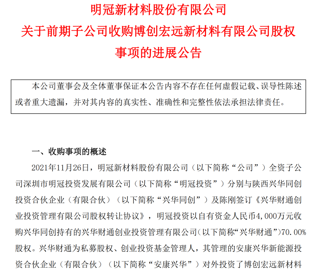 回溯事件过往。2021年11月,明冠新材全资子公司深圳市明冠投资发展有限公司(以下简称“明冠投资”)以自有资金4000万元收购兴华同创持有的兴华财通70.00%股权。兴华财通为私募股权、创业投资基金管理人,其管理的安康兴华对外投资了博创宏远,投资总额为3500万元,持有博创宏远35.00%股权。此项投资使得明冠新材间接持有了博创宏远股权。