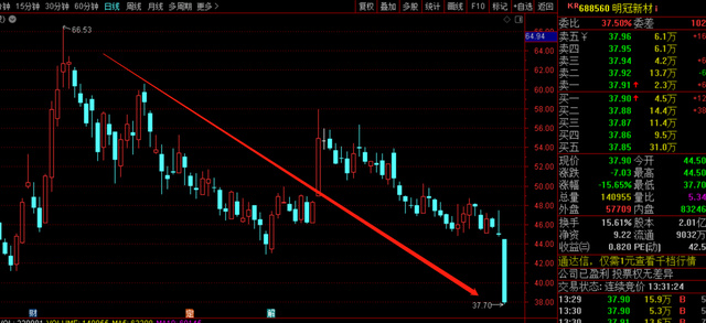 2月28日,明冠新材开盘出现闪崩,盘中一度重挫16%,截止发稿时,明冠新材依然大跌15%,股价报于37.9元,总市值76亿。