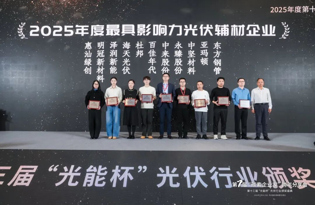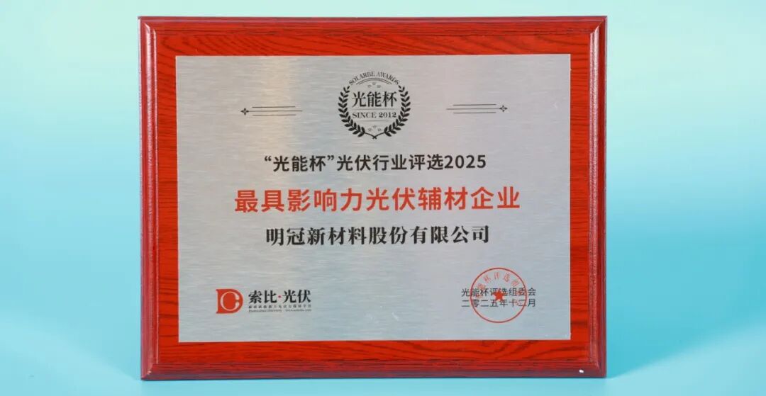 1月14日至15日,第七届“碳索”企业家跨年分享会在苏州举行。会议以“新能源·新经济·新繁荣”为核心命题,旨在深入勾勒从能源革命到普遍繁荣的价值传导路径。在同期“光能杯”光伏行业颁奖盛典中,明冠新材凭借卓越的产品力与创新实力,荣膺“2025年度最具影响力光伏辅材企业”奖项。