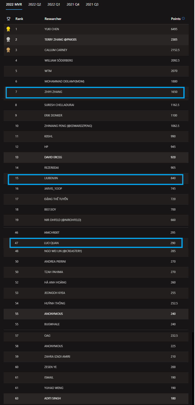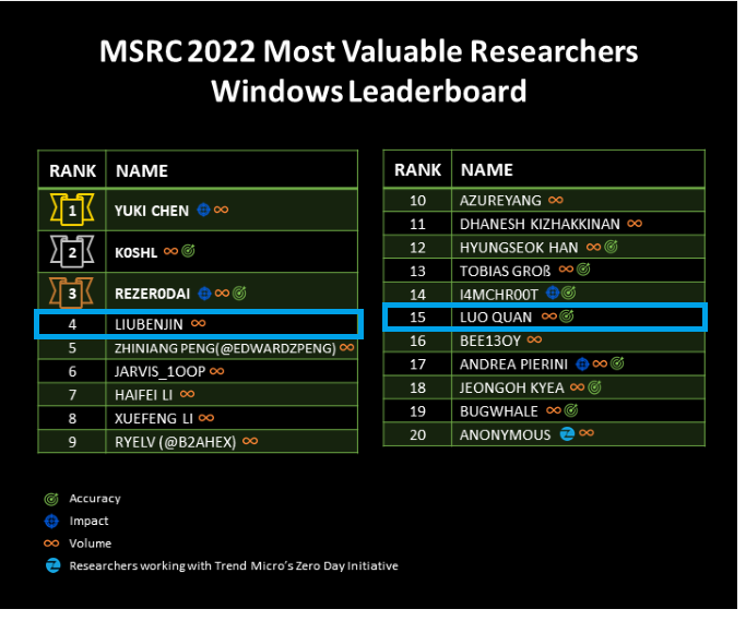 MSRC 2022 最具价值研究者– Windows操作系统榜单
