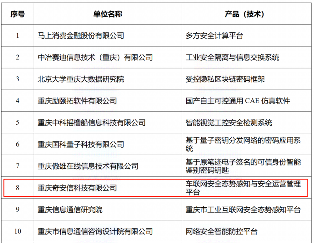 9月13日,在2023重庆网络安全宣传周启动仪式上,市委网信办、市经济信息委公布了重庆市网络安全产品和技术名单,奇安信“车联网安全态势感知与安全运营管理平台(VSOC)”入选,是唯一入选该名单的车联网领域安全项目。