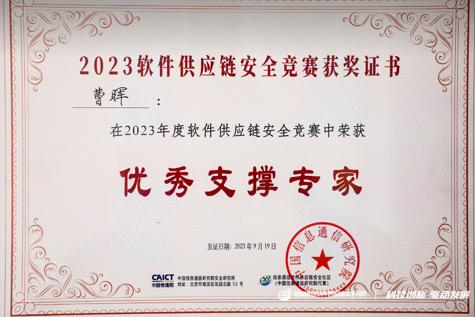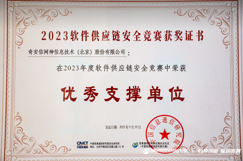 论坛上还举行了2023年度软件供应链安全竞赛颁奖仪式。凭借对大赛的全面支持,奇安信及安全专家获得“优秀支撑单位”“优秀支撑专家”两项荣誉。