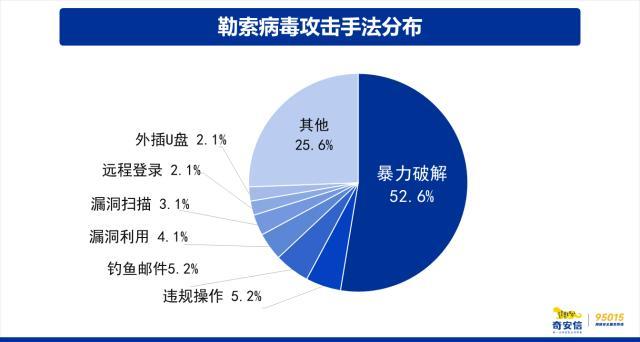 同时,与其他各类传统网络攻击相比,勒索病毒攻击极少有使用0day漏洞或高级攻击手法的情况发生。统计显示,52.6%的攻击事件使用了暴力破解,有49.5%的事件与弱口令有关。