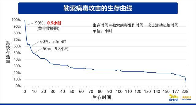 为了能够更加精确的分析防范勒索病毒攻击所需要的响应速度,以“攻击时长”数据为基础,《报告》绘制了勒索病毒攻击的“生存曲线”。统计显示,0~30分钟是勒索病毒攻击应急响应的“黄金救援期”,系统生存率仍在90%以上;以590分钟为临界点,超过该临界时间点,系统被成功投毒的概率就会大于生存概率。