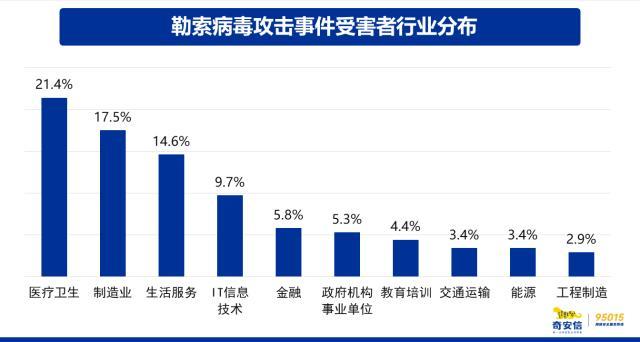 《报告》显示,医疗卫生行业是勒索病毒攻击的重灾区,报案数量占到勒索病毒攻击事件报案总数的21.4%;制造业排名第二,占比为17.5%;生活服务紧随其后,占比为14.6%。