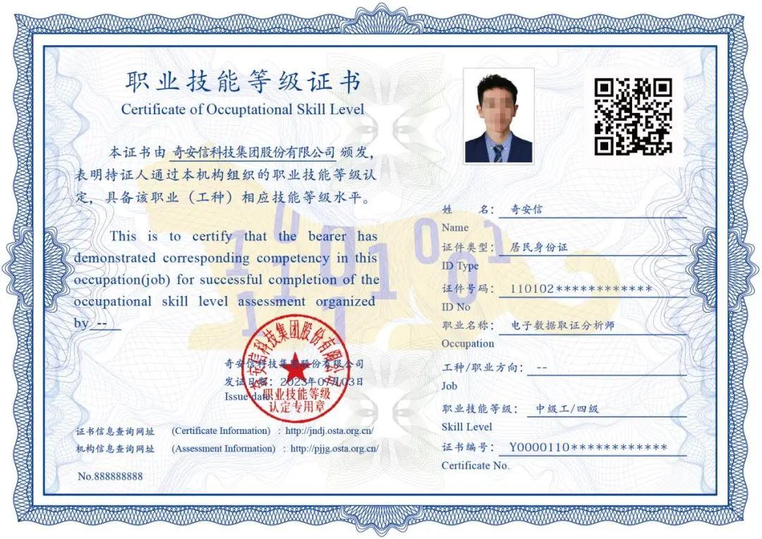 近日,中国首批电子数据取证分析师(四级-中级工)职业技能等级认定证书由奇安信联合人力资源和社会保障部北京市职业技能鉴定中心颁发。