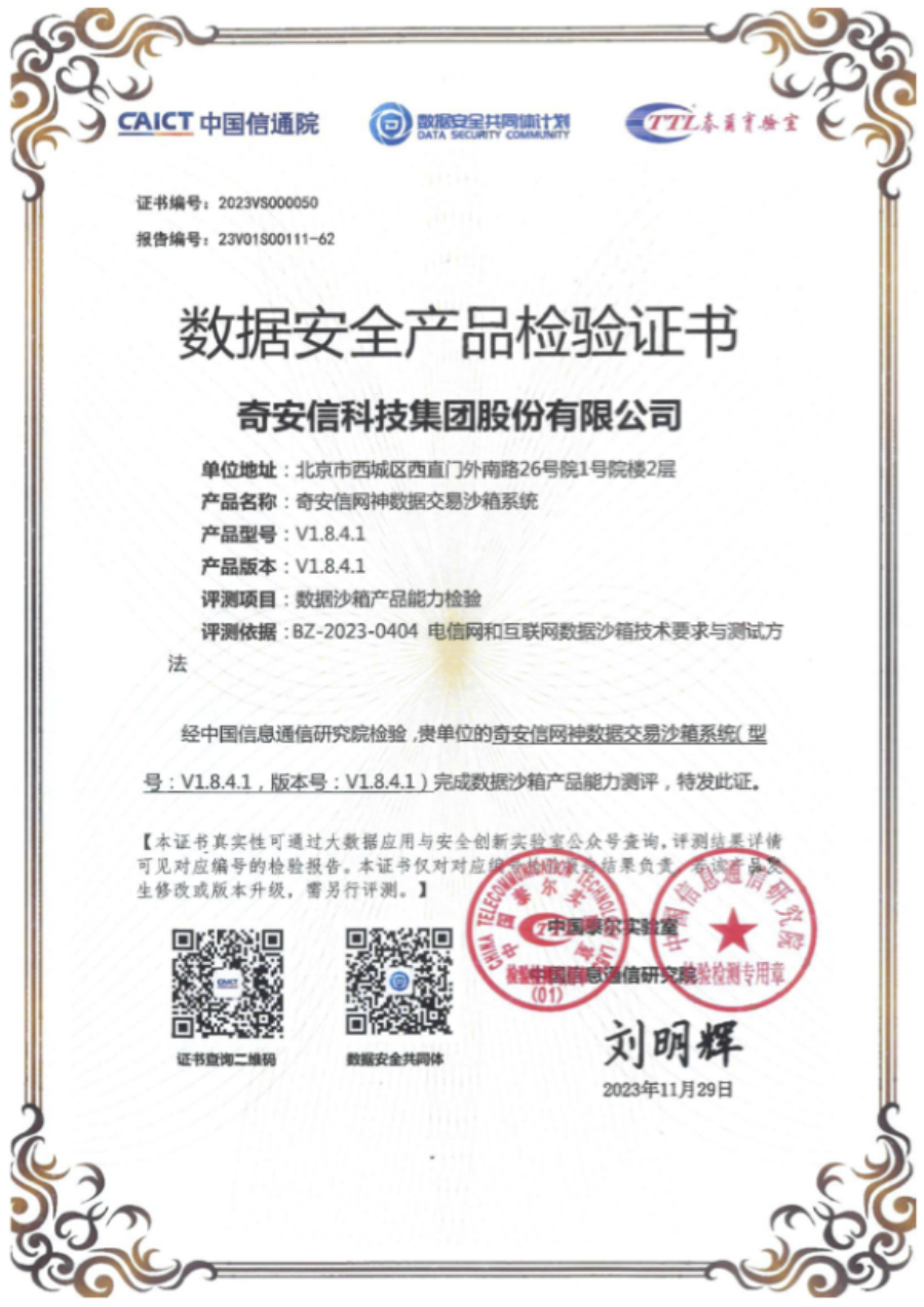 奇安信集团的“奇安信网神数据交易沙箱系统”凭借其创新技术和强大应用能力,成为首个通过评测的产品,展现了该公司在数据安全领域的领导地位和对技术进步的贡献。