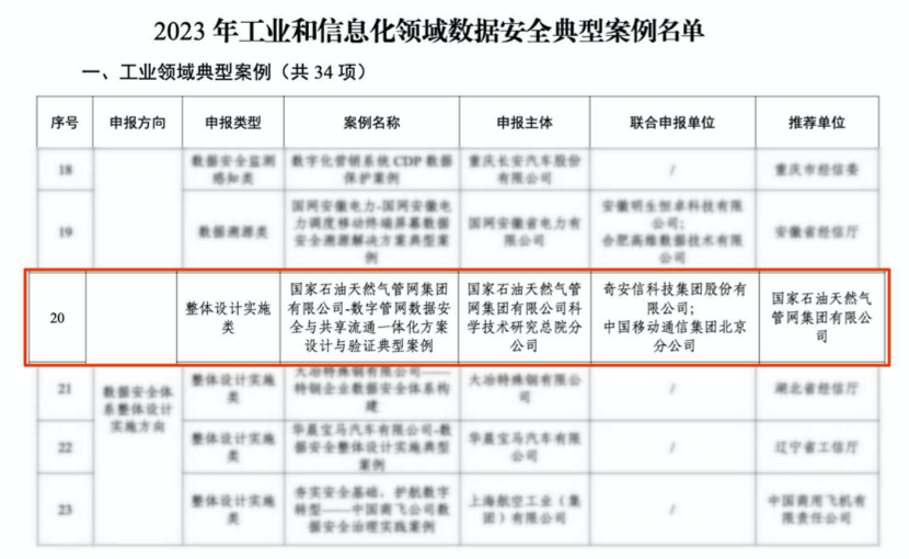 近日,工业和信息化部网络安全管理局公布了2023年工业和信息化领域数据安全典型案例名单。奇安信集团携手国家石油天然气管网集团有限公司和北京移动打造的数字管网数据安全与共享流通一体化方案设计与验证案例成功入选数据安全体系整体设计实施方向的典型案例。