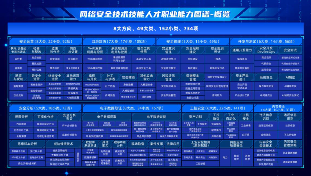 图谱包括安全运营、网络攻防、安全管理、开发与测试、安全分析等5个通用安全技术方向,以及电子数据取证、工控安全、内容安全等3个专向安全技术方向,共8大方向、49大类、152小类、734项具体能力,是目前国内外最为系统、最为全面、最细粒度,也是最为符合中国网络安全实战、实践要求的网络安全人才能力图谱。不仅可以作为高等院校和职业院校网络安全人才培养的参考框架,还可以作为岗前岗后培训,以及网络安全人才自修自学的参考框架。
