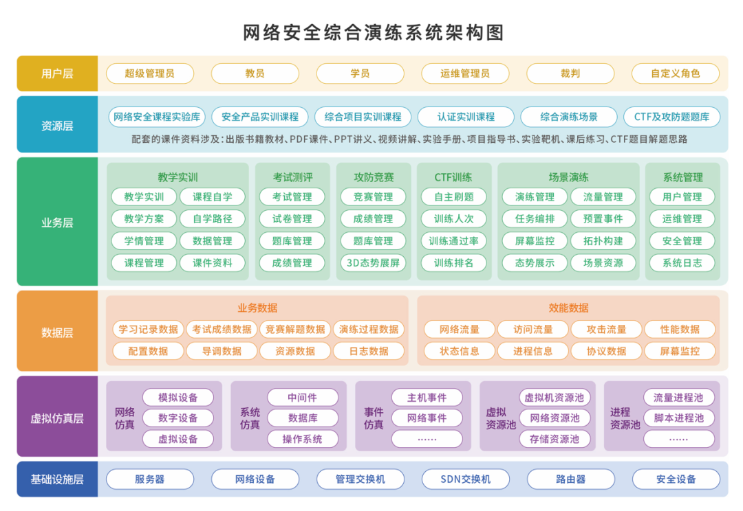 同时,系统还内置了丰富的教学实训资源,包括基于TKS能力评估模型的网络安全课程体系、100余本出版教材、60余门课程、1000余个实验、10000余分钟的教学视频以及4000余道测评题目等,为高校网络安全人才的培养提供了坚实的基础。