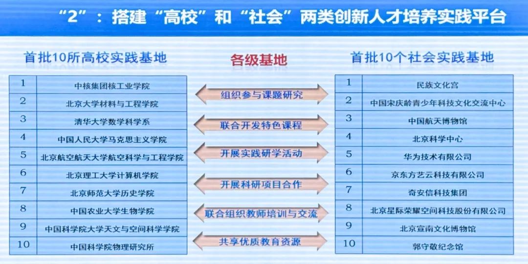 本届教育科研月上成立了北京青少年创新学院西城分院,其首批14个区级培养基地和1个创新实验基地以及10个高校实践基地和10个社会实践基地授牌成立,首批专家指导团成员获颁聘书。