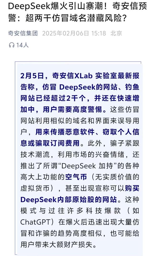 2 月 6 日,据"奇安信集团"官微消息,奇安信 XLab 实验室发布最新报告:"仿冒 DeepSeek 的网站、钓鱼网站已经超过 2 千个,并还在快速增加中,用户需要高度警惕。"(注:奇安信集团成立于 2014 年,是国内网络安全领域的领军企业,专注于为政府、企业用户提供新一代企业级网络安全产品和服务。)