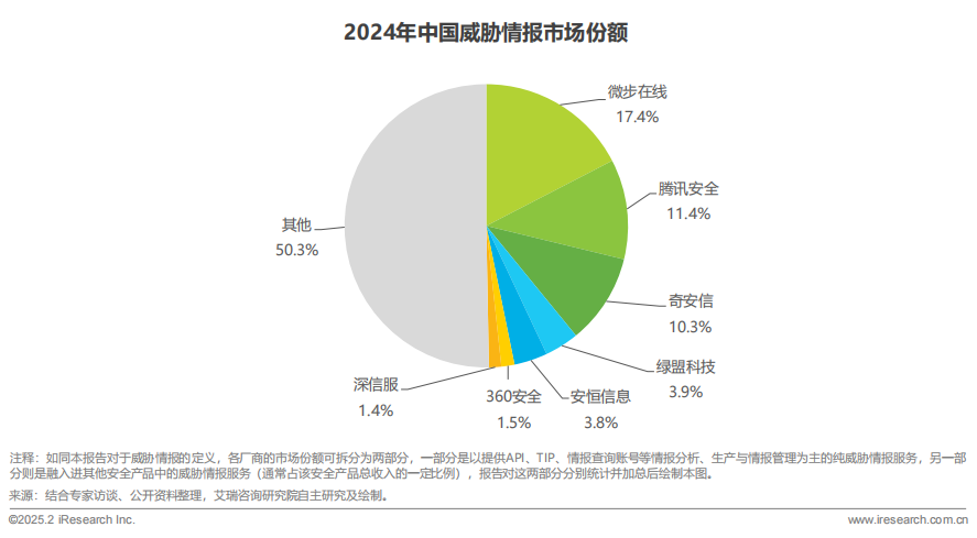 2024 年中国威胁情报市场,排名前三的安全厂商分别是微步在线(17.4%)、腾讯安全(11.4%)与奇安信(10.3%),第四到第七位分别是绿盟科技(3.9%)、安恒信息(3.8%)、360安全(1.5%)、深信服(1.4%)。