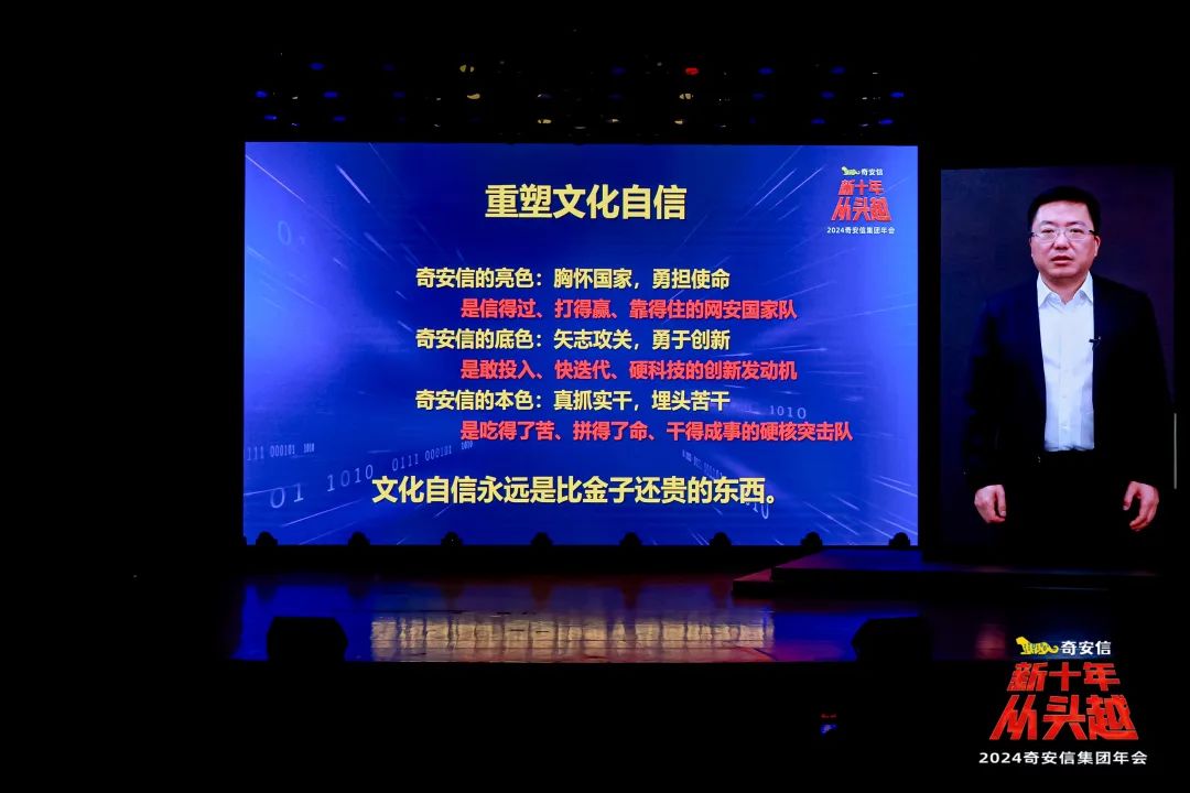 第一件事是要重塑文化自信。奇安信的亮色就是胸怀国家,勇担使命;底色就是矢志攻关,勇于创新;本色就是真抓实干,埋头苦干。这些是续写十年辉煌的底气,也是每位奇安信人心中的文化自信,永远是比金子还宝贵的东西。
