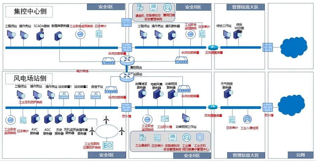 为了规避上述新能源电力项目中常见的网络安全问题,结合该油田低碳示范区风电项目的整体建设方案,奇安信安全专家将业务流转、不同层次的物理信息系统以及网络安全整合起来,从实际业务运营角度评估安全风险和安全防护,基于“三同步”原则(同步规划、同步建设、同步运行),制定了一份全面且针对性强的解决方案,确保安全措施能够全面覆盖、深度融合电力系统建设,并实现强制管控。