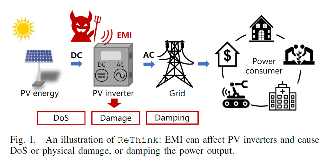 团队成员揭示了逆变器在物理域面临的新安全威胁,并系统地分析了逆变器在高频电磁信号作用下的感知和控制脆弱性。本文深入剖析了物理域电磁信号在差分运放类传感器电路中的传递路径,明确指出漏洞根源在于差分运放电路的非线性整流效应、非对称差分效应、级联放大效应等非理想特性。研究发现ReThink这类物理域安全新威胁,能够以非侵入式、难以溯源的方式,导致逆变器功能宕机、输出功率降低乃至物理损毁,还能影响用电设备甚至所在电网的稳定性,严重威胁关键基础设施安全。现有集中在数字域的安全防护技术,如加密认证和流量监测等,难以直接应对此类威胁。为此,研究团队从屏蔽滤波、硬件修复和软件检测等方面提出了防护方法。