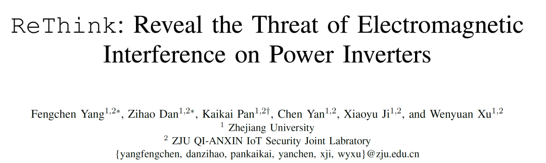 近日,第32届网络与分布式系统安全研讨会(NDSS)在美国圣迭戈举办。由浙江大学与奇安信技术研究院合作发表的论文《ReThink: Reveal the Threat of Electromagnetic Interference on Power Inverters》在会议录用的211篇论文中脱颖而出,获得杰出论文奖(Distinguished Paper Award)。NDSS是网络和系统安全领域的四大顶级国际学术会议(BIG4)之一,也是中国计算机学会CCF的A类会议,至今已举办32届,今年论文录取率仅为16%。