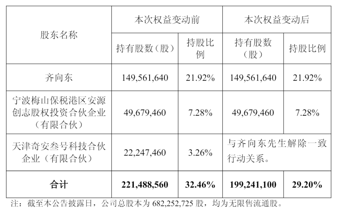 本次权益变动后,公司控股股东、实际控制人齐向东及其一致行动人安源创志合计控制公司股份199,241,100股,占公司总股本的比例为29.20%。