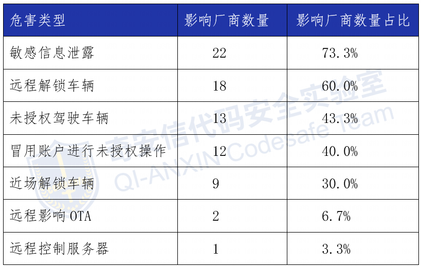《报告》显示,漏洞危害已经覆盖数据安全、车辆安全、账户安全等核心领域。超七成厂商面临敏感信息泄露,数据安全风险尤其突出。