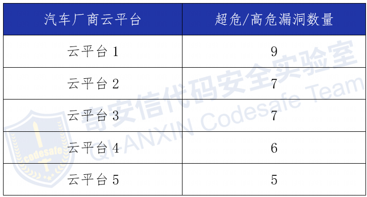 30家汽车厂商云平台中,有23家存在超危/高危漏洞,占比高达76.7%,这些漏洞可直接导致未授权解锁车辆、未授权驾驶车辆、敏感信息泄露等严重后果。超危/高危漏洞数量最多的厂商云平台存在9个超危/高危漏洞,前5名厂商累计存在34个超危/高危漏洞。