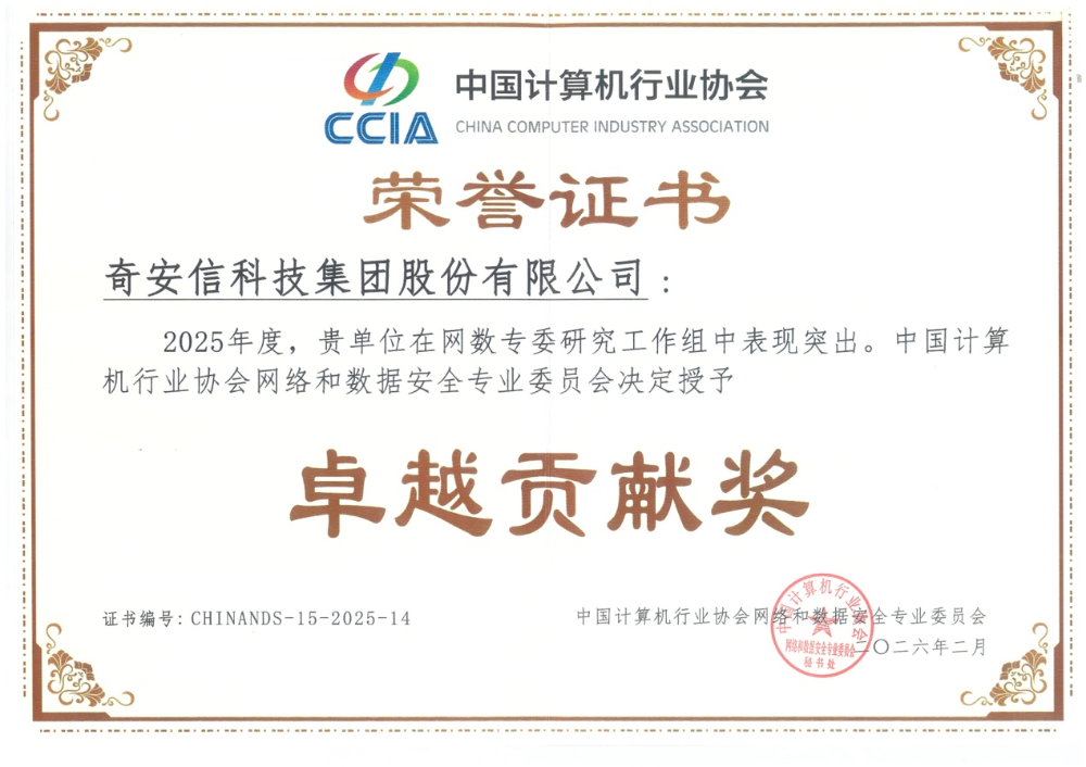 近日,中国计算机行业协会网络和数据安全专业委员会、黑灰产检测与反制工作委员会在京召开2025年度工作会议。会上,奇安信集团被授予"卓越贡献奖",以表彰其在2025年度网数专委研究工作组中的突出表现。