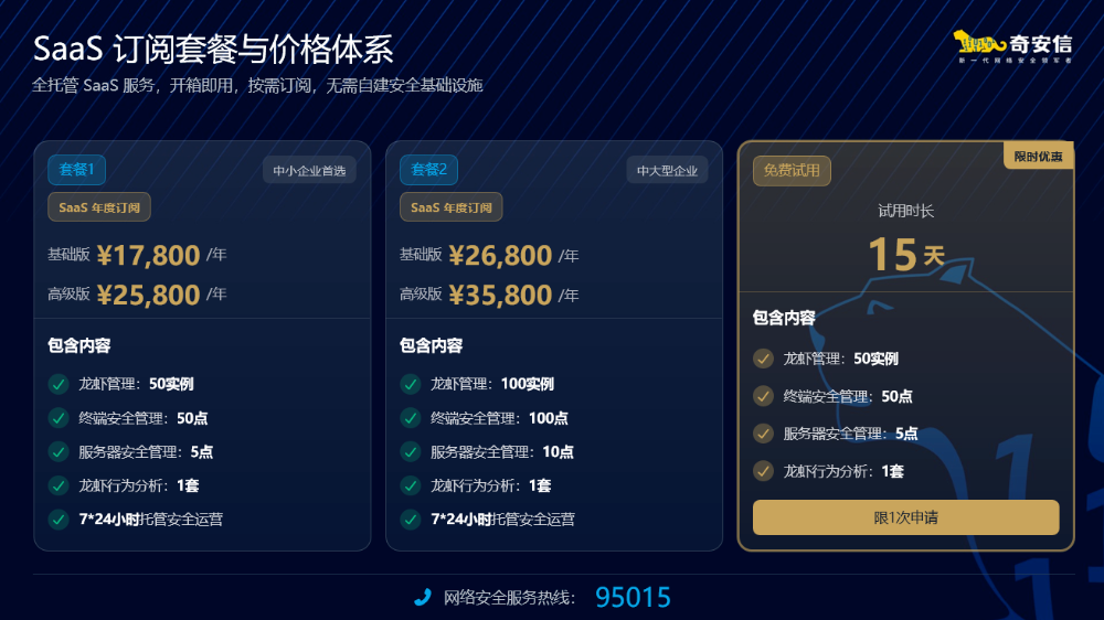 产品针对不同规模企业推出阶梯式套餐,中小企业套餐基础版仅¥17,800/年,支持50个龙虾实例、50点终端、5点服务器及1套龙虾行为分析功能,高级版¥25,800/年;中大型企业套餐基础版¥26,800/年,高级版¥35,800/年,支持100个龙虾实例及更多终端、服务器管理,所有套餐均提供7*24小时托管安全运营服务。