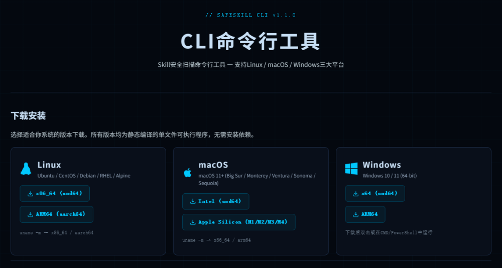 为了满足开发者和企业自动化的需求,SafeSkill正式开放了完整的API和CLI命令行工具。
