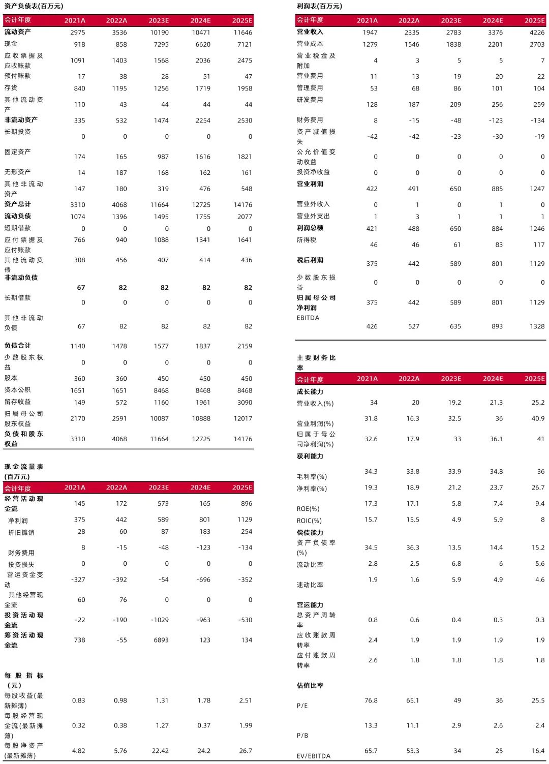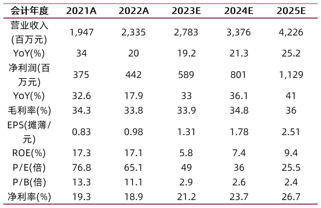 预计公司2023-2025年EPS分别为1.31\1.78\2.51,对应公司8月29日收盘价64.05元,2023-2025年PE分别为49.0\36.0\25.5,首次给予“增持-A”评级。