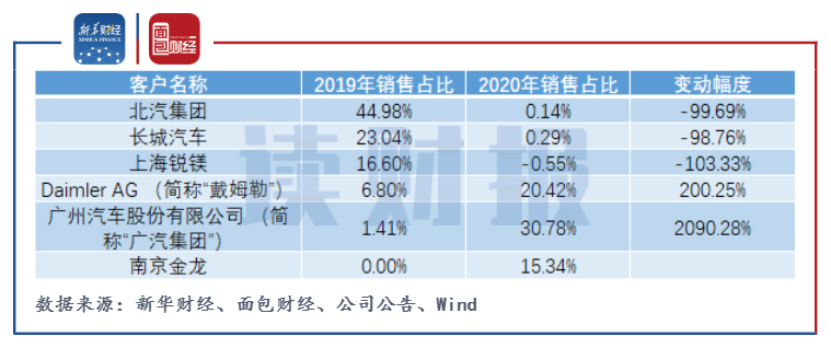 北汽集团等主要客户销售额占比骤降。北汽集团、长城汽车和上海锐镁在2019年是孚能科技前三大客户,该年度这三大客户的销售占比分别为44.98%、23.04%和16.6%。2020年这三大客户的销售占比骤降,销售占比分别下降至0.14%、0.29%和-0.55%(存在部分退货),前三大客户几乎全部流失。受此影响,2020年公司营业收入同比大幅下降54.29%。
